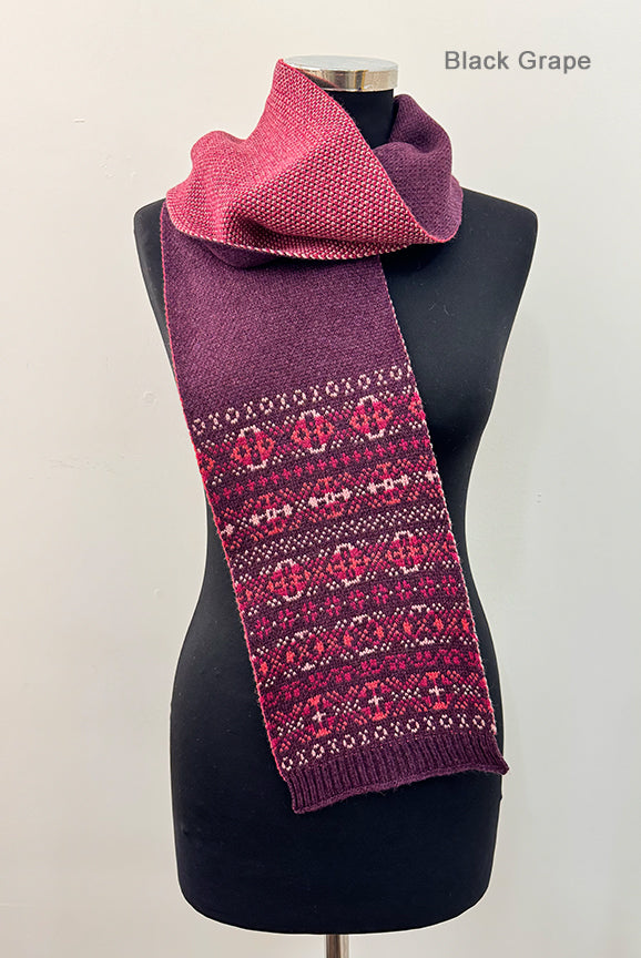 A stylish unisex scarf featuring Fair Isle patterns inspired by Aunty May's knitting. The jacquard back makes this scarf reversible.
